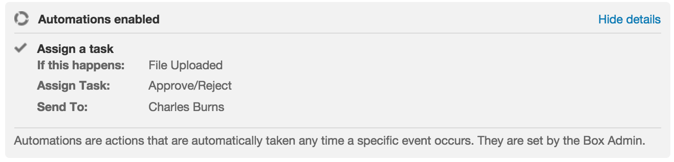 - If you are accessing the folder where an Automation originates anonymously via a shared link (that is, you’re not logged in to Box or not part of the organization), you won’t see any Automation notification at all.