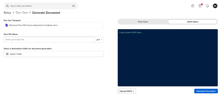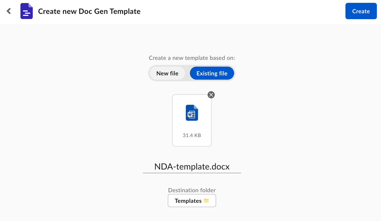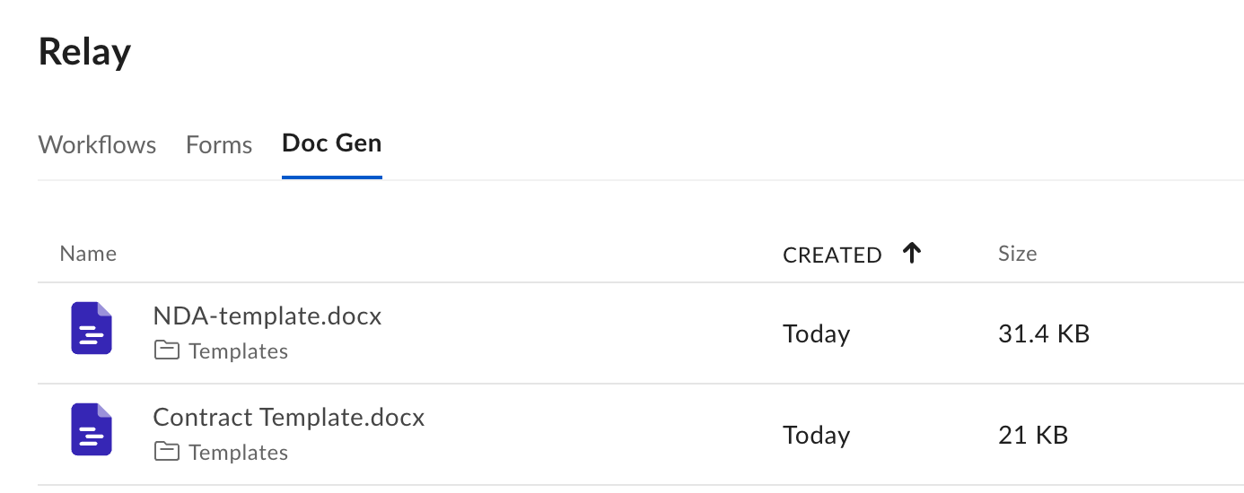 Click Create. The template will be added to the provided folder and automatically marked as a Doc Gen template. It will also be visible under the Doc Gen tab in Relay.