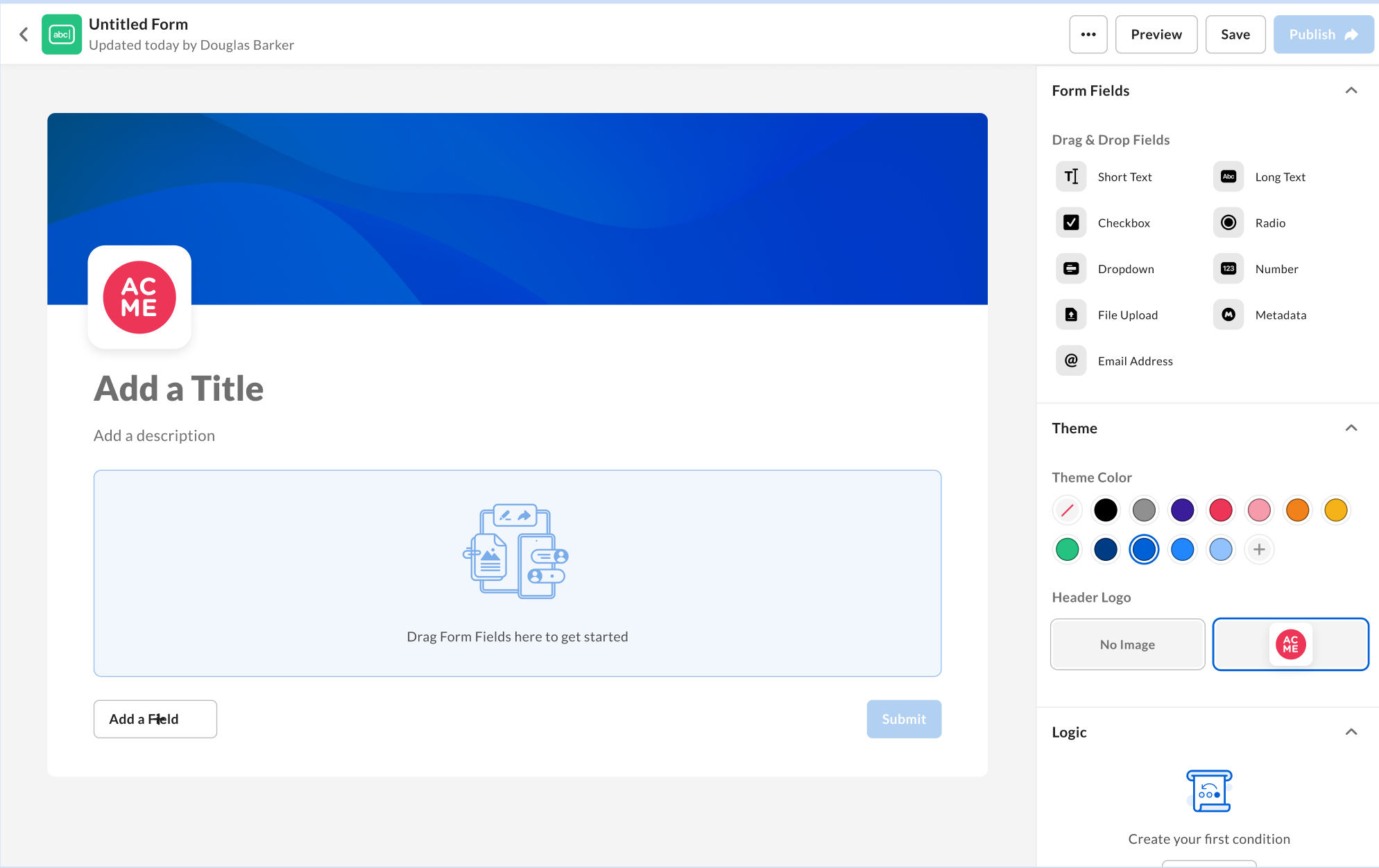 Once a form is completed, you can click Preview to review the form prior to sharing it. From the Preview tab, you can test out the fields and conditions to ensure all work appropriately. Submissions in preview are not included in the form submissions page.Publishing a Form