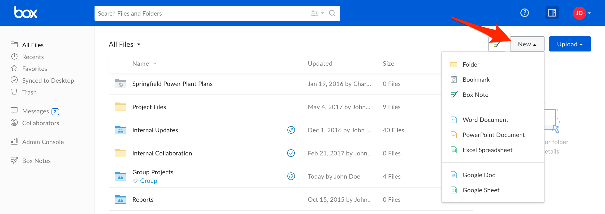 - Choose what you would like to create. You can create a new Folder, Bookmark (to any URL), Box Note, Microsoft Office file, or Google document. The options shown here may differ based on the settings you or your account admin have enabled.