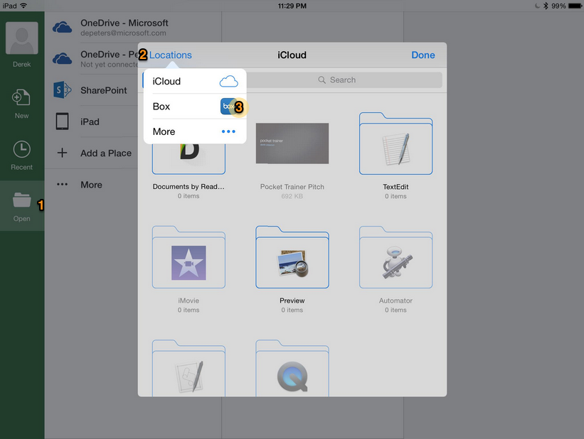 When Box third-party users open a file, they are presented with options. The options include cloud providers who have their applications installed on the device and who have implemented Document Provider. To open a Box file in Excel, users click Open (1), Locations (2), and then select Box (3). (To add Box as a Content Provider in Microsoft Office apps, see: To set up Box as a Content Provider).