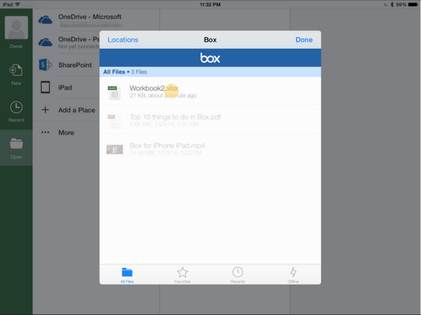 When Excel users select Box, iOS displays the Document Picker window with the Box Document Picker UI. Excel users can navigate their folders in Box from this view and select and open the file.