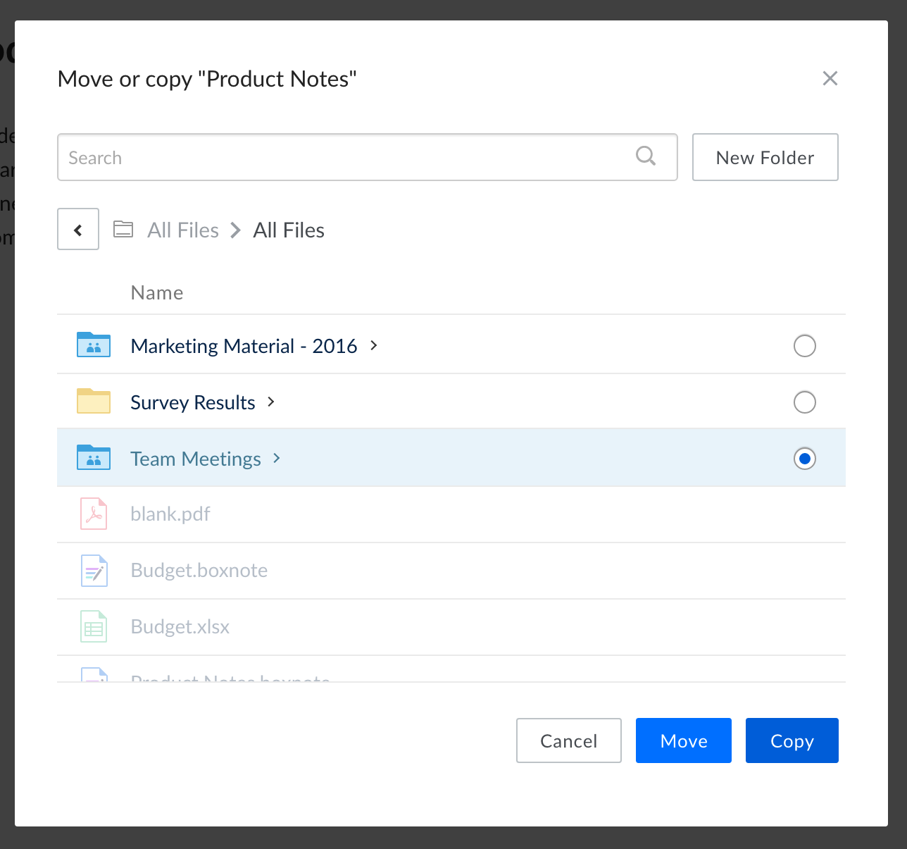 - In the window that appears, select a destination folder by clicking the bubble beside its name. If you do not select a folder, the file will be moved or copied into the folder that you are currently viewing.