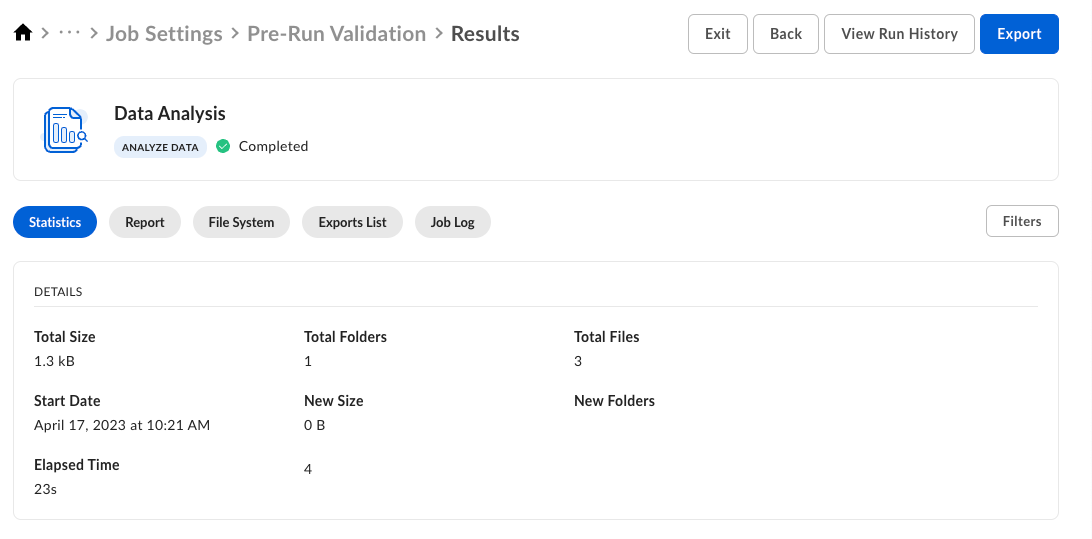 You can view the results when the analysis is done, but also when it is still running - to check the progress. Access the results by clicking View Job Report. The Analysis report presents information about what kind of data there is, how old it is, how much you have and how it is distributed across users and filesystems, and who has access to that data. Analysis report details make it easier to divide a large complicated job into smaller more manageable jobs, and make informed decisions on what to move and what to leave behind. This allows big projects to finish more quickly, cost-effectively, with fewer conflicts, and allowing for more efficient delta runs. The Filters button on the right activates a side panel you can use to display specific results.