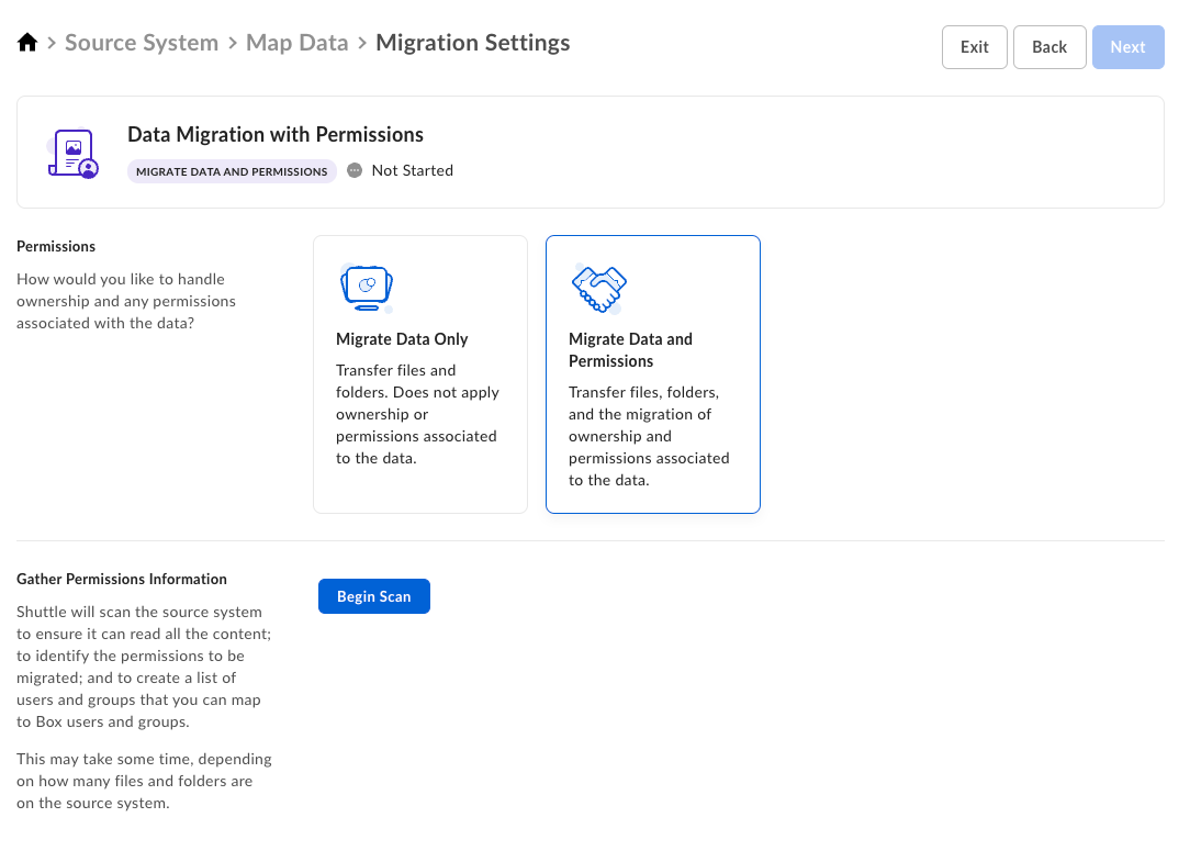 - A new section appears, allowing you to collect information about permissions applied to source files and folders. Click Begin Scan to scan the source items.