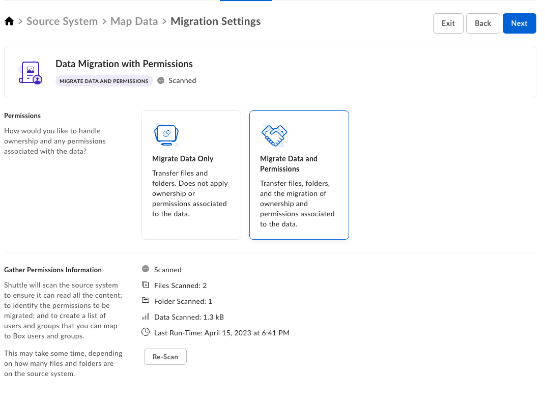 Box Shuttle acts as an intermediary between various content management systems, allowing you to transfer folders, files, permissions, and metadata from these platforms to Box. You have two options to migrate your data:- Migrate data only: migrates a selected source path to an account or folder to the selected target location without applying permissions.