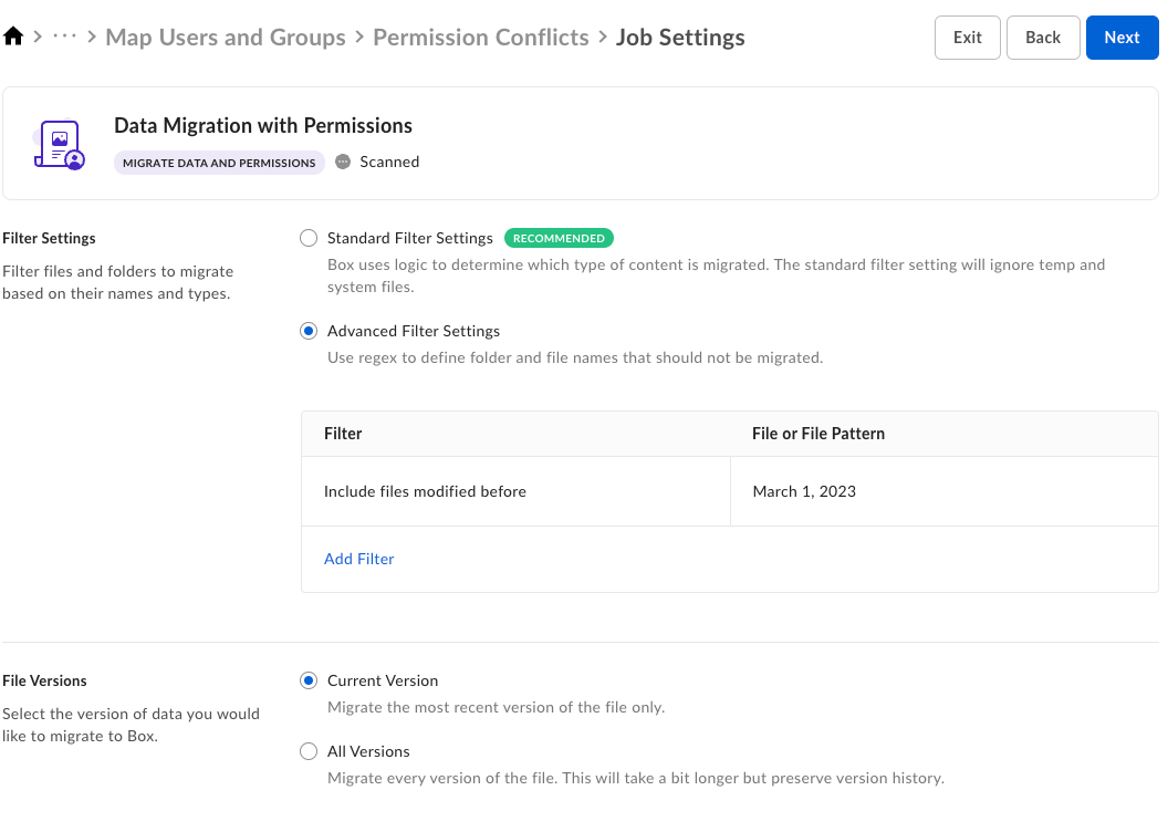 The presence of file version settings depends on the source system chosen. For example, migration from Windows files will only have filter settings available for you to use.