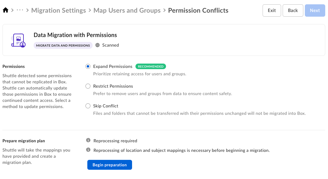 At this point, you can choose how to resolve permission conflicts during the data migration.- Expand permissions is an option recommended for most migrations to preserve the access to data on Box that customers had access to on the source.
