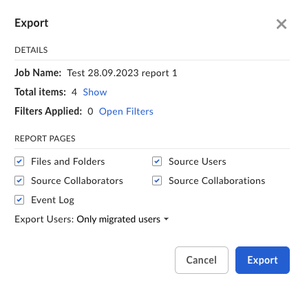 - In the Job Report section, click Export. If you want to export a report for a past job, go to the report list and click View Job Report.