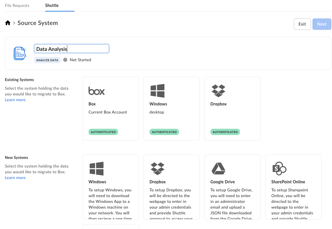 For information on how to set up a particular source system, use the following references. For details on standard and advanced sources, see Box Shuttle standard and advanced tooling.Before deleting or removing any content from the source system, validate that the migration completed successfully and that all content is present in Box or backed up elsewhere.