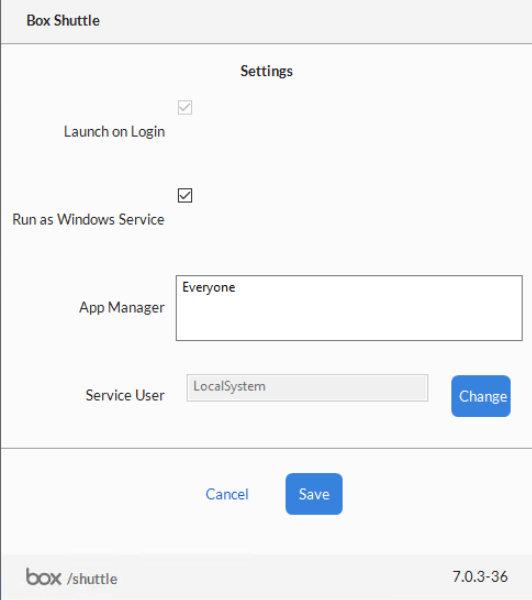Box Shuttle Windows Agent runs as an application by default. However, in the Windows environment, when a user starts an application and then logs out, the application shuts down and data transferred by it also stops. A solution to this is running the Windows Agent as a service rather than as an application because services continue to run after the user logs out and the data transfer continues as well. Whether it is running as an application or a service, for obvious reasons Windows Agent will stop transferring files if the computer on which it is installed powers down. The major difference in running the agent as a service is that while it can access networked drives, it does not access those drives by mapped drive letters (for exampleC:/, X:/, Y:/ drive). Instead, the drives will display as they would if you were to access them off the network – typically in the format \\servername\ folder.