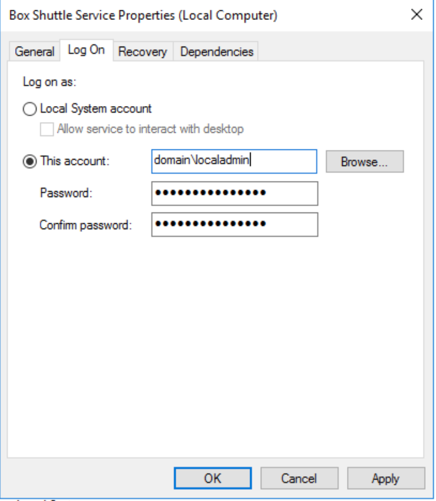 LocalSystem, close the error dialog and select the Change button from the system tray pop-up. - The Services window displays. Find the Box Shuttle Service in the list, right-click and select Properties.