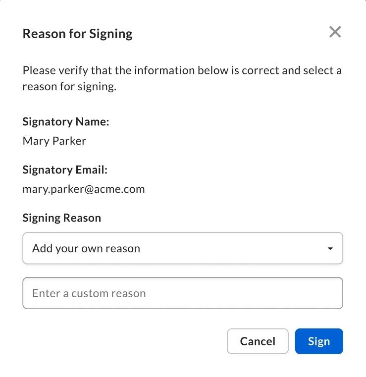 - A custom signing reason configured by the Admin or Co-Admin