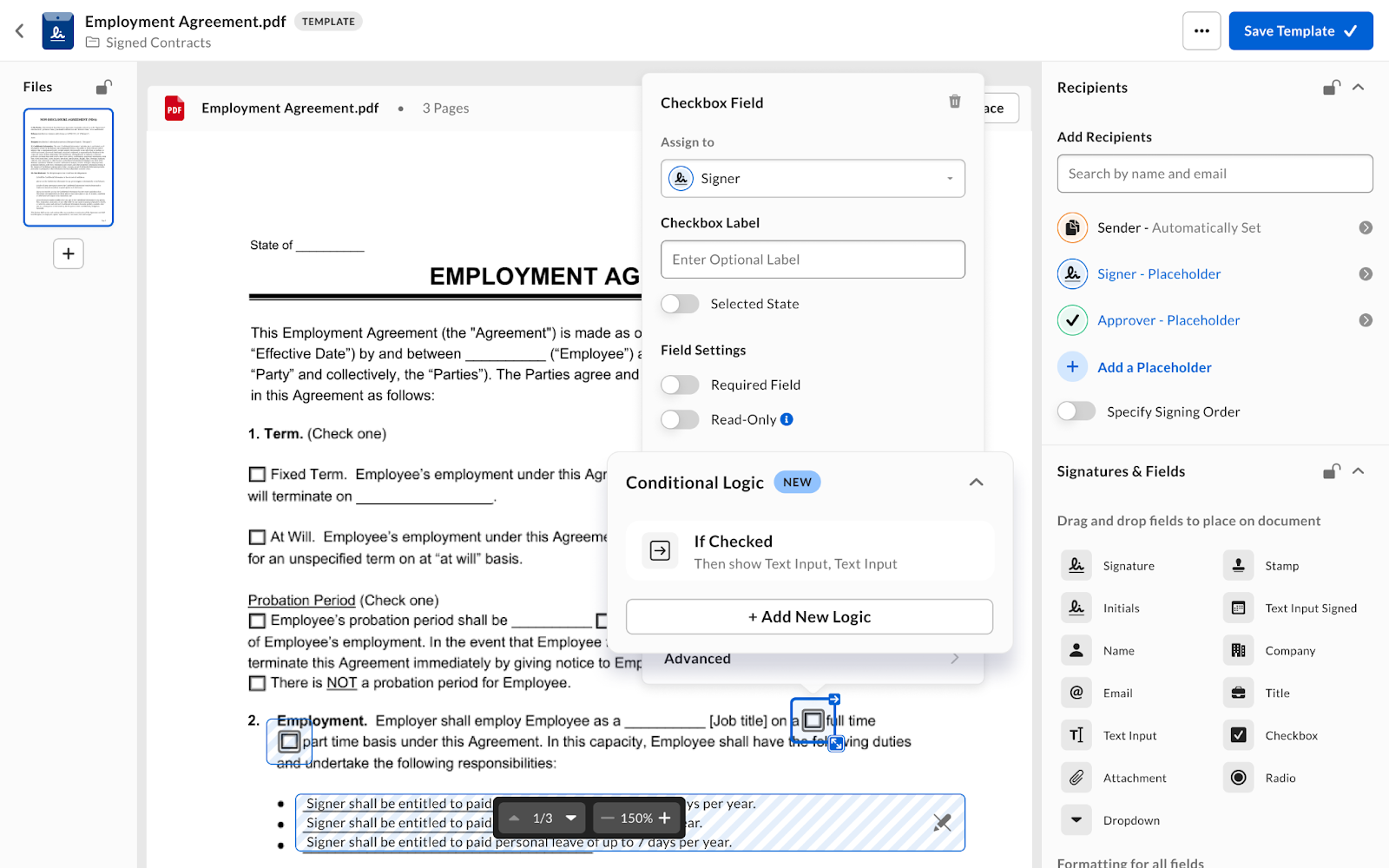 Conditional logic determines which fields appear or remain hidden based on field settings configured by the sender or template creator. Follow these steps to configure fields with conditional logic when preparing a signature request:- Create or Modify a signature request or reusable template.