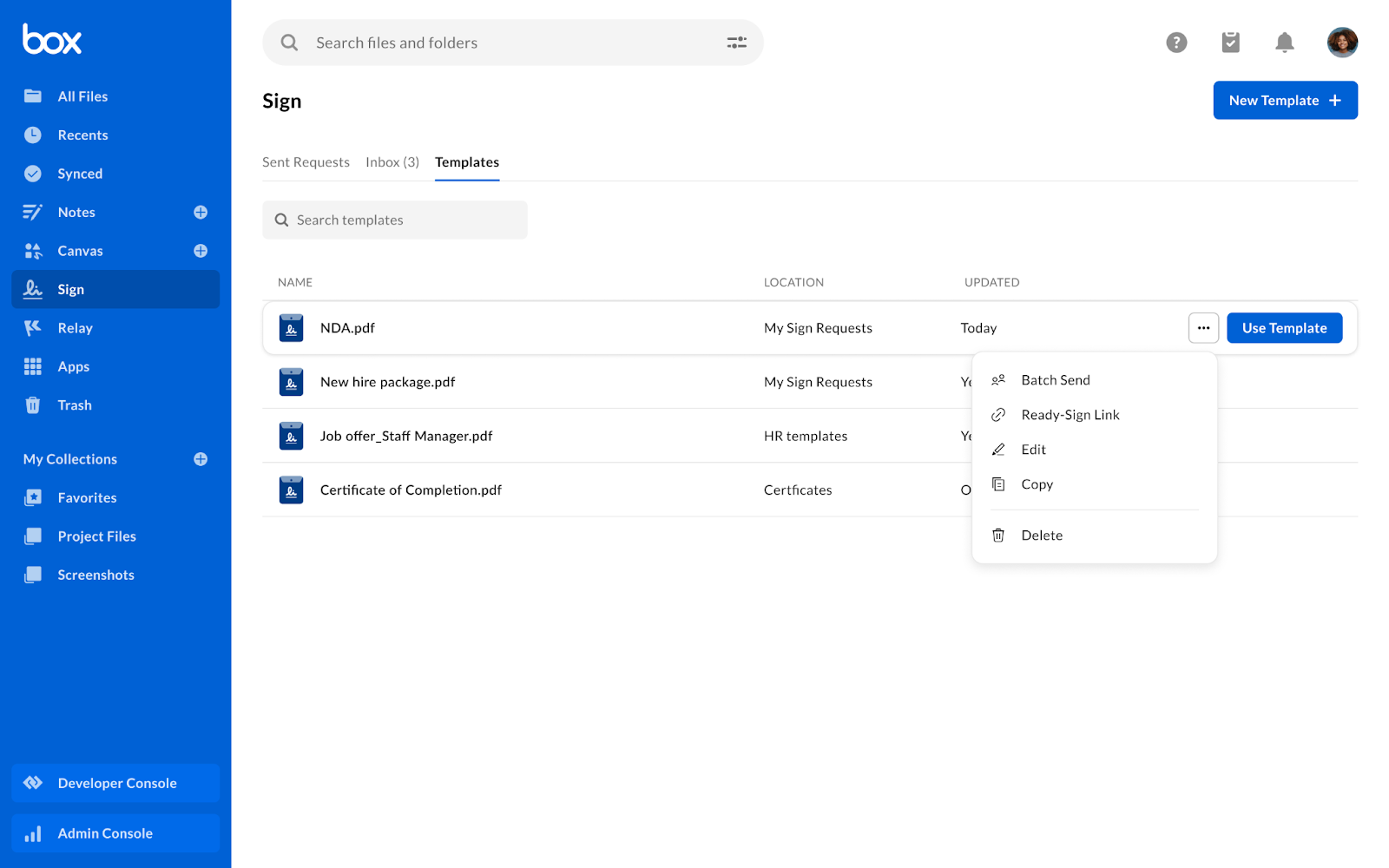 - From your Box account, go to Sign -> then Template