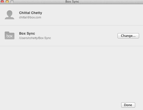 - The Box Sync settings window automatically displays the newly-selected folder location for Box Sync. Click Done. The Box Sync settings screen reverts to the Box Sync home screen.