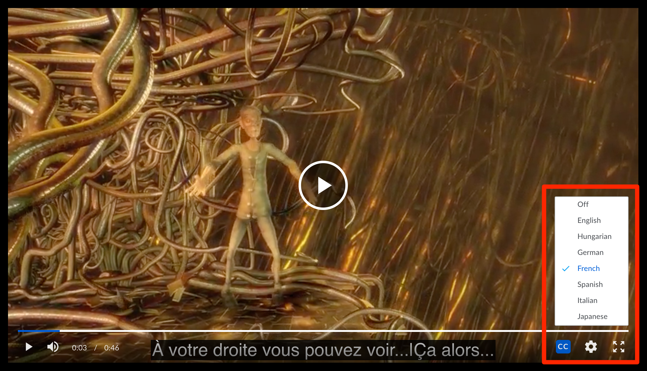 Lorsque vous prévisualisez un fichier vidéo qui inclut une piste de sous-titres/sous-titres codés, vous verrez un bouton marqué CC dans la fenêtre d’aperçu. Cliquez sur ce bouton pour activer ou désactiver les sous-titres. Si votre vidéo inclut plusieurs pistes de sous-titres/sous-titres pour différentes langues, vous pouvez sélectionner une piste de sous-titres spécifique en ouvrant le menu Paramètres (icône d’engrenage) et en cliquant sur Sous-titres/CC. Sélectionnez la piste de sous-titres appropriée et les sous-titres s’afficheront en bas de l’écran.