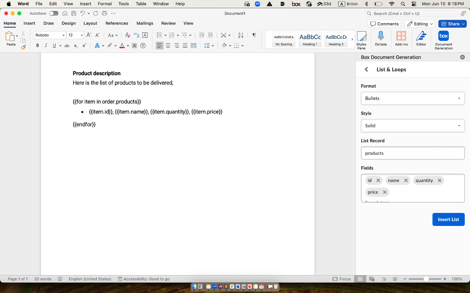 Box Doc Genテンプレートは動的な計算をサポートしています。 手動でタグ付け言語に計算コードを書き込むか、Box Doc Gen Template Creatorアドインを使用することができます。 例:- 請求書の個々の明細項目から正味請求額の合計を決定する: Sum (請求書の個々の明細項目の金額)