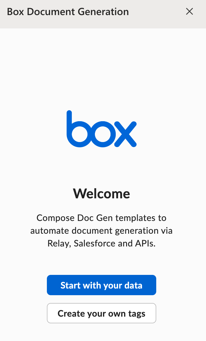 Box Doc Genテンプレートの作成を開始する前に、Microsoft Word用Box Doc Gen Template Creatorアドインをインストールしてください。 アドインは、インストールに成功すると、Microsoft Word内のリボンメニューに表示されます。 選択すると、Box Doc Genパネルが右側に表示されます。Box Doc Genテンプレートの作成