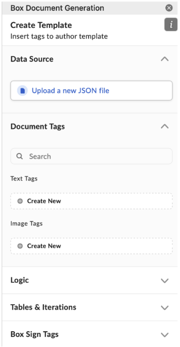 Box Doc Genテンプレートの作成では、[ドキュメントタグ]、[ロジック]、[表と箇条書き] のほか、[Box Signタグ] も使用できます。