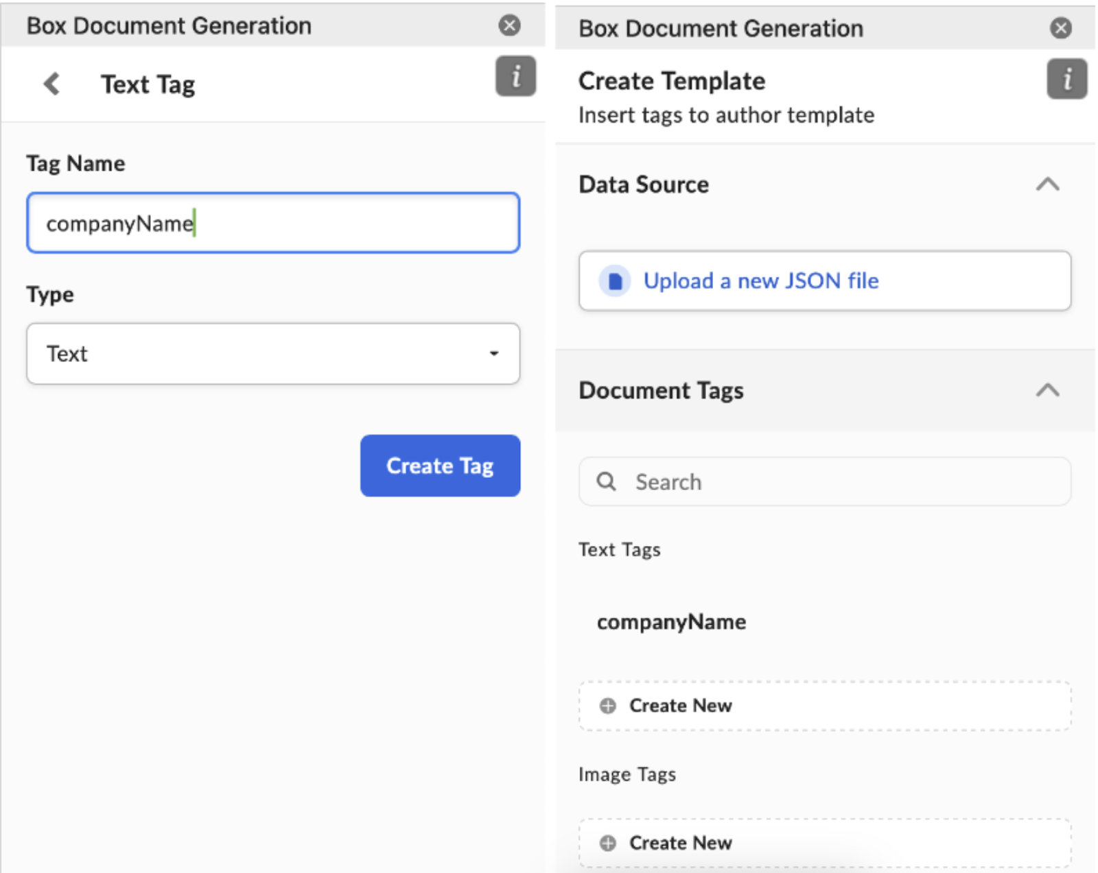 注: Box Doc Genテンプレートタグでは、タグ内のキーワード間のスペースまたはハイフンがサポートされていません。 例えば、{{company name}} や {{company-name}} はサポートされません。