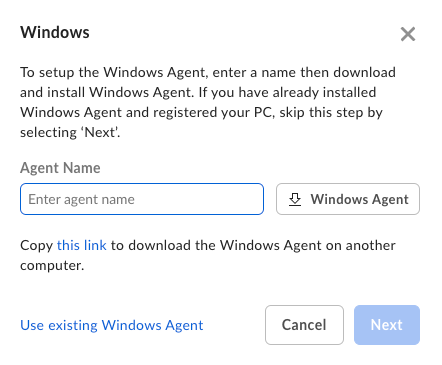 Windowsエージェントを、転送するデータが格納されているマシンか、そのマシンにドライブとして接続されているマシンにダウンロードします。 または、リンクをコピーし、それを使用してエージェントをダウンロードします。