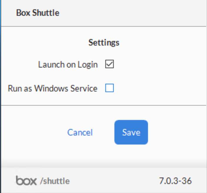 Box Shuttle Windowsエージェントは、デフォルトではアプリケーションとして実行されます。 ただし、Windows環境では、ユーザーがアプリケーションを起動した後にログアウトすると、アプリケーションはシャットダウンされ、そのアプリケーションによるデータ転送も停止します。 これを解決するには、Windowsエージェントをアプリケーションではなくサービスとして実行します。サービスはユーザーがログアウトした後も実行を継続し、データ転送も続行されるためです。 アプリケーションまたはサービスとして実行されている、いずれの場合であっても、インストール先のコンピュータの電源が切れた場合、Windowsエージェントはファイルの転送を停止します。 エージェントをサービスとして実行する場合の大きな違いは、ネットワークドライブにアクセスできる一方で、マッピングされたドライブ文字 (C:/、X:/、Y:/ドライブなど) ではそのドライブにアクセスしない点です。代わりに、ドライブはネットワーク外からアクセスした場合と同様に表示されます (通常は\\servername\フォルダの形式)。