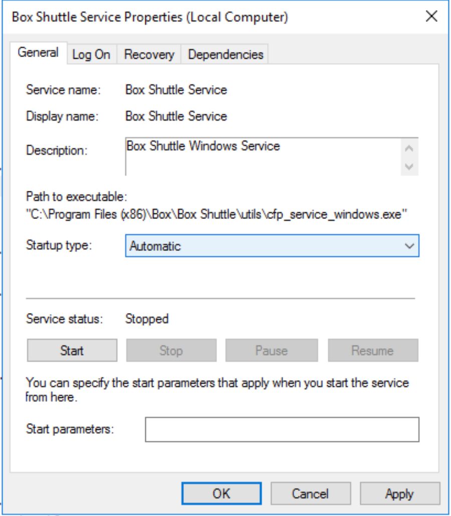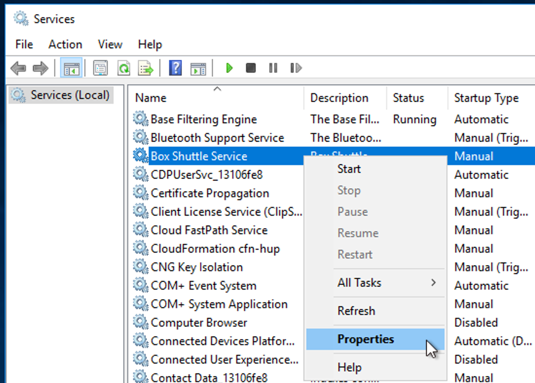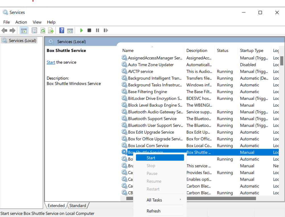 - もう一度 [Box Shuttle Service (Box Shuttleサービス)] を右クリックし、[開始] を選択してサービスを開始します。