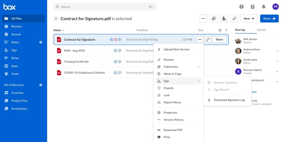 - Box Signのホームページで、Boxアカウント内にある署名済みドキュメントのタイトルにカーソルを置きます。