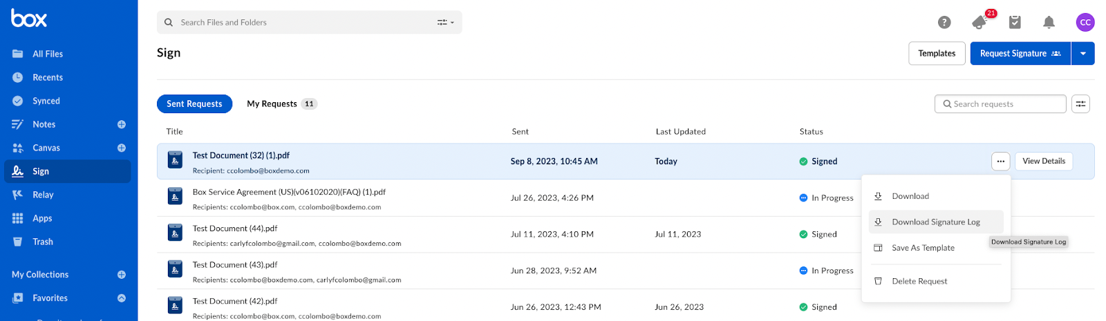 注: 完了した署名リクエストのダウンロード権限を持つコラボレータは、署名ログにアクセスしてダウンロードすることができます。